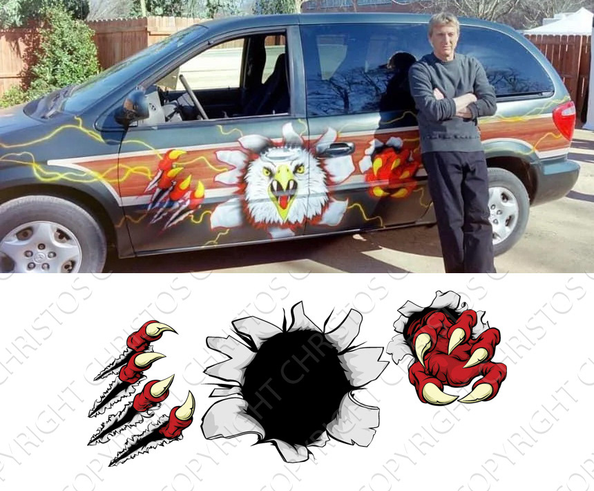 My claws illustration tearing out of the Eagle Fang van from the Cobra Kai, Karate Kid spin off series while Johnny Lawrence (William Zabka) leans on it.