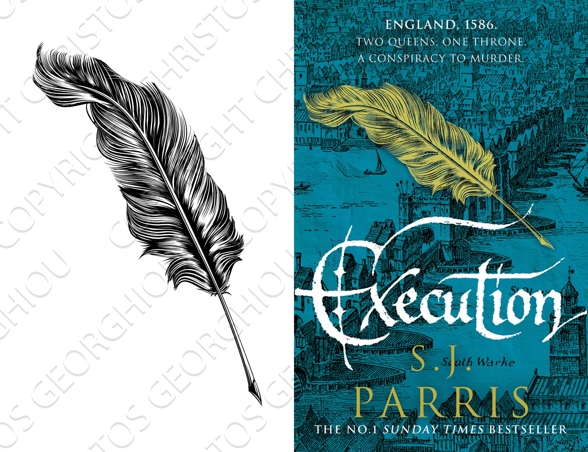 My quill feather pen vintage woodcut intaglio engraving style illustration used on a best-selling book cover.